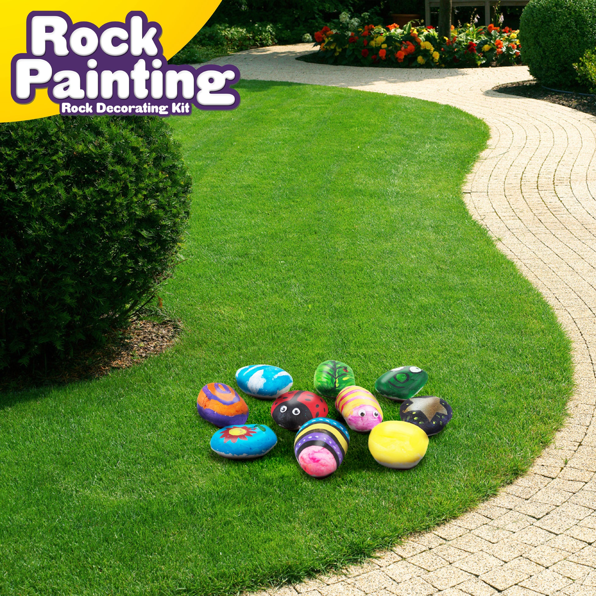 - ALL ACCESSORIES INCLUDED – Extensive Set Includes [10] White, Glossy River Stones, [2] Brushes, [12] Vibrant Color Paints, [2] Transfer Sheets & [8] Googly Eyes