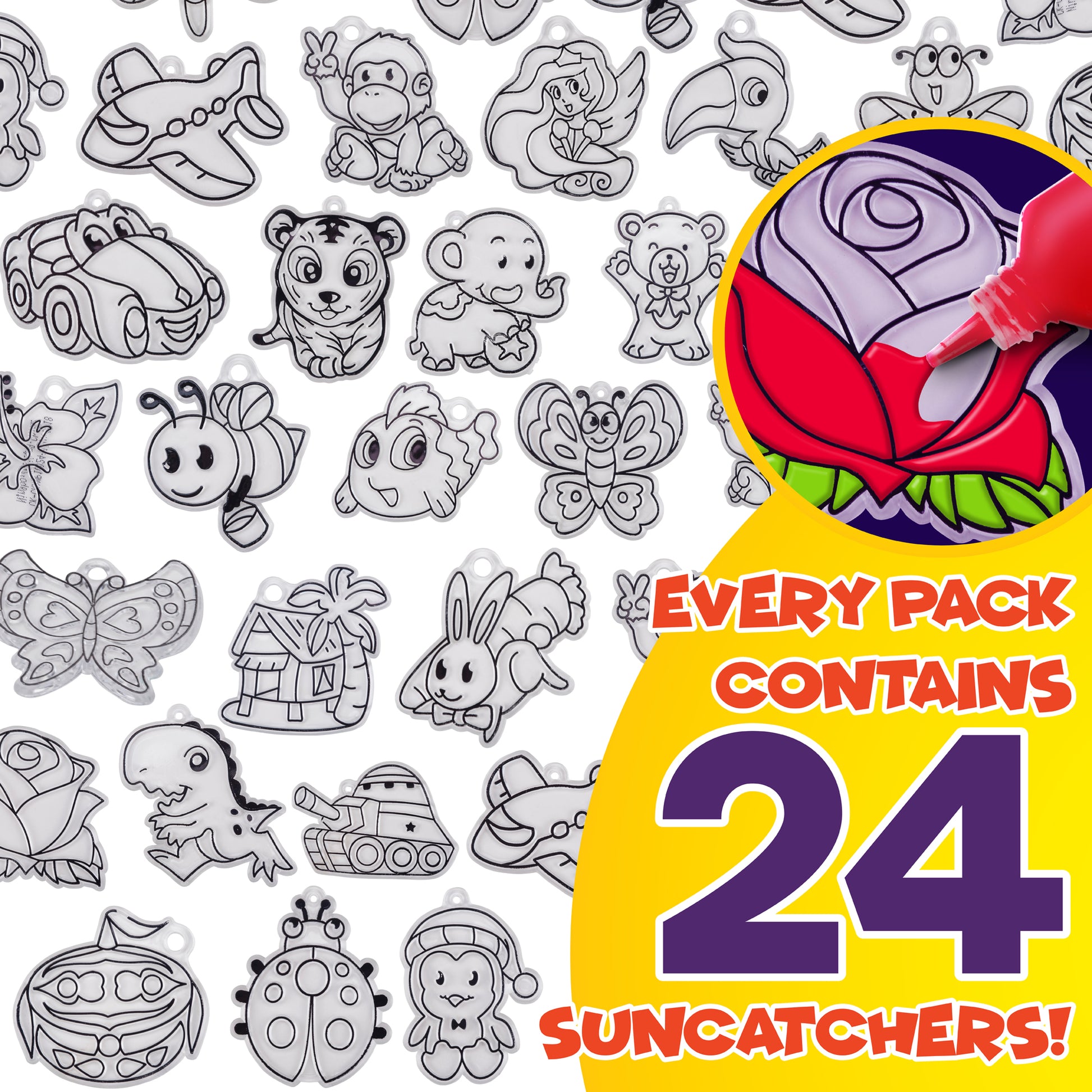 - DOZENS OF DESIGN SUPPLIES – Including [24] Adorable Sun Catcher Stickers, [24] Sturdy Suction Cups, [11] Vibrant Shades of Non-Toxic Paint & [4] Yards of Cord